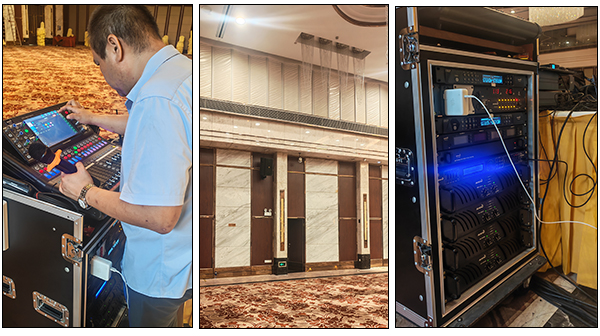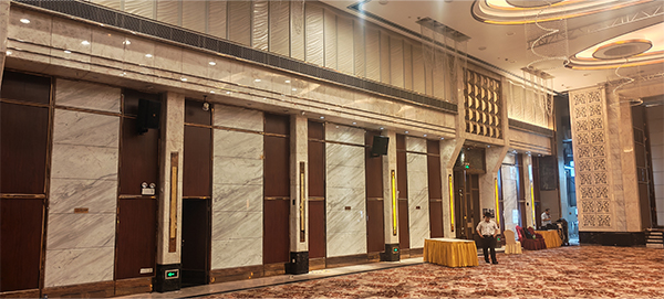 考虑到东莞珠江国际酒店宴会大厅空间大、活动类型多样,我司专业团队深入调研,采用线阵列音箱,均匀分布在宴会大厅四周,确保声音能够全面、均衡地覆盖每一个角落,无论是前排还是后排的宾客,都能有清晰的听觉体验。同时,配备了专业的音频处理设备,可根据不同活动场景快速调节音效。